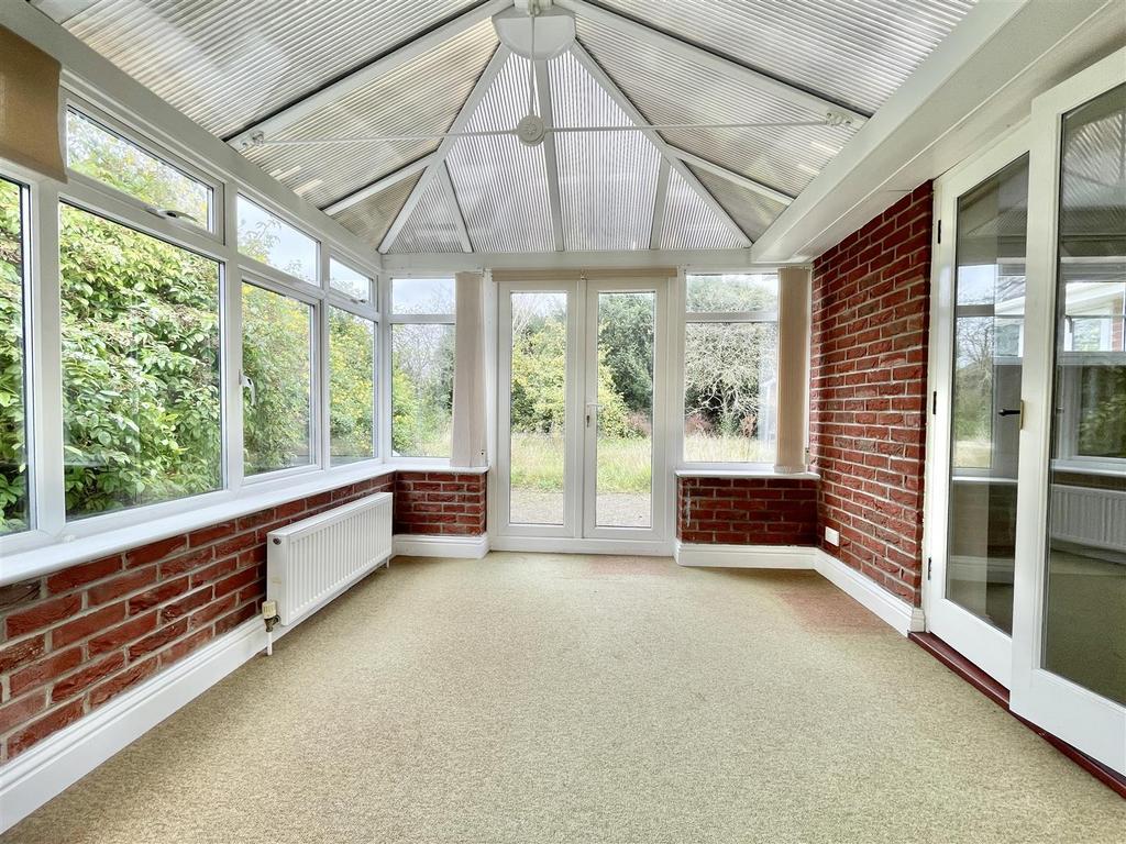 Detached 'executive' style bungalow set within small cluster development. Roughly 1200 sq.ft of accommodation. 4 bedrooms. En-suite bathroom. Living Room with open fireplace. Generous rear garden with fruit trees. Double garage and driveway space. Would benefit from some modernisation. No onward chain.