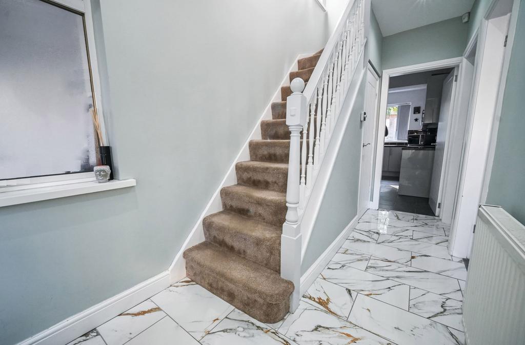 Porch: PVC double glazed door with matching side window and terracotta tiled flooring. Entrance Hall: Internal PVC double glazed door with opaque side windows, radiator, recessed ceiling spot lights, marble effect tiled flooring, internal double glazed opaque side window and L-Shaped staircase to first floor with storage cupboard below.
