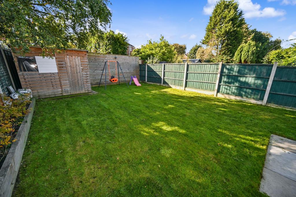 Rear Garden: Sympathetically landscaped to provide a most useful outdoor space creating a most pleasant setting whilst offering low maintenance, the garden includes a full width paved patio with porcelain style slabs, white dwarf wall with steps leads to the raised shaped lawn, side border with raised timber sleepers, exterior lighting & water supply, garden shed and surrounding fencing.