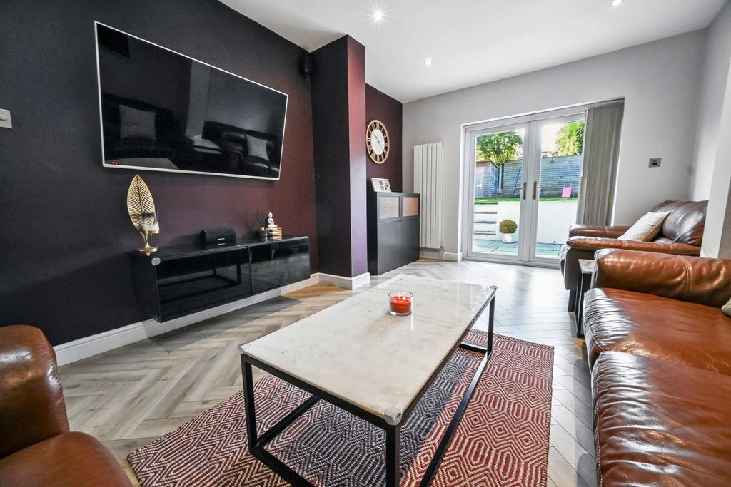 Living Room: 17’7’’ (5.39m) x 11’3’’ (3.44m max)/ 10’9’’ (3.29m min) Twin vertical white radiators, recessed ceiling spot lights, Herringbone style LVT flooring and double glazed French doors to rear garden.