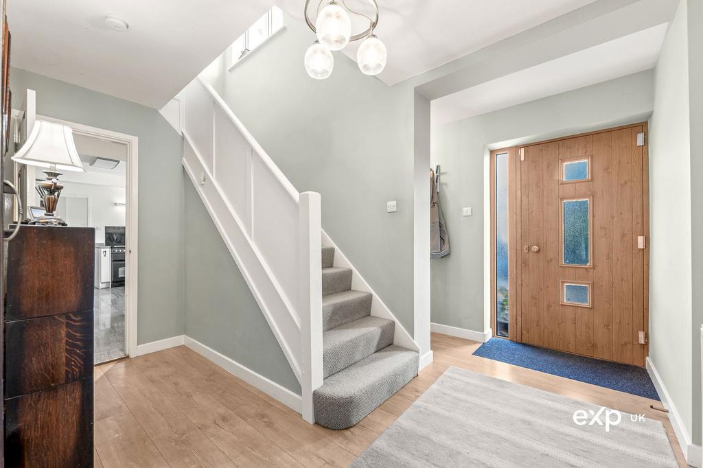 Accessed from the driveway, the front door with a sidelight window opens into a welcoming hallway. Decorated in neutral tones and finished with smart wood-effect flooring, there is a radiator and stairs leading up to the first floor with a useful storage cupboard.