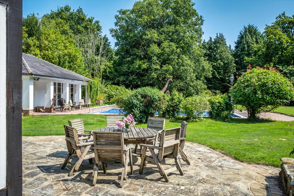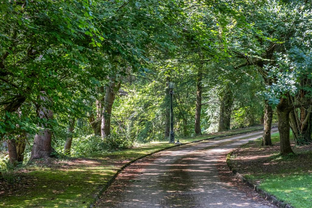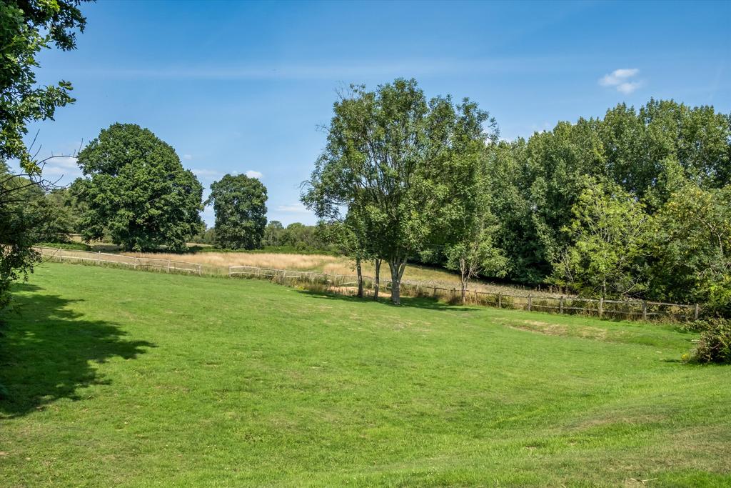 The property boasts a charming mini-island pond adjacent to the house, complete with a seating area and a savannah-style hut. Along the driveway, nestled within light woodland, are a series of small ponds adding to the serene atmosphere. Nearby, you’ll find an outdoor heated swimming pool accompanied by a spacious pool house featuring a games room, its own kitchen, and a shower room. The house itself is positioned at the end of a winding driveway, surrounded by mature trees that provide privacy and natural beauty. At the rear, there is a tennis court that requires resurfacing. To the west lies the main expanse of open land—an extensive, tree-lined field with no public footpaths, offering peaceful and private countryside space