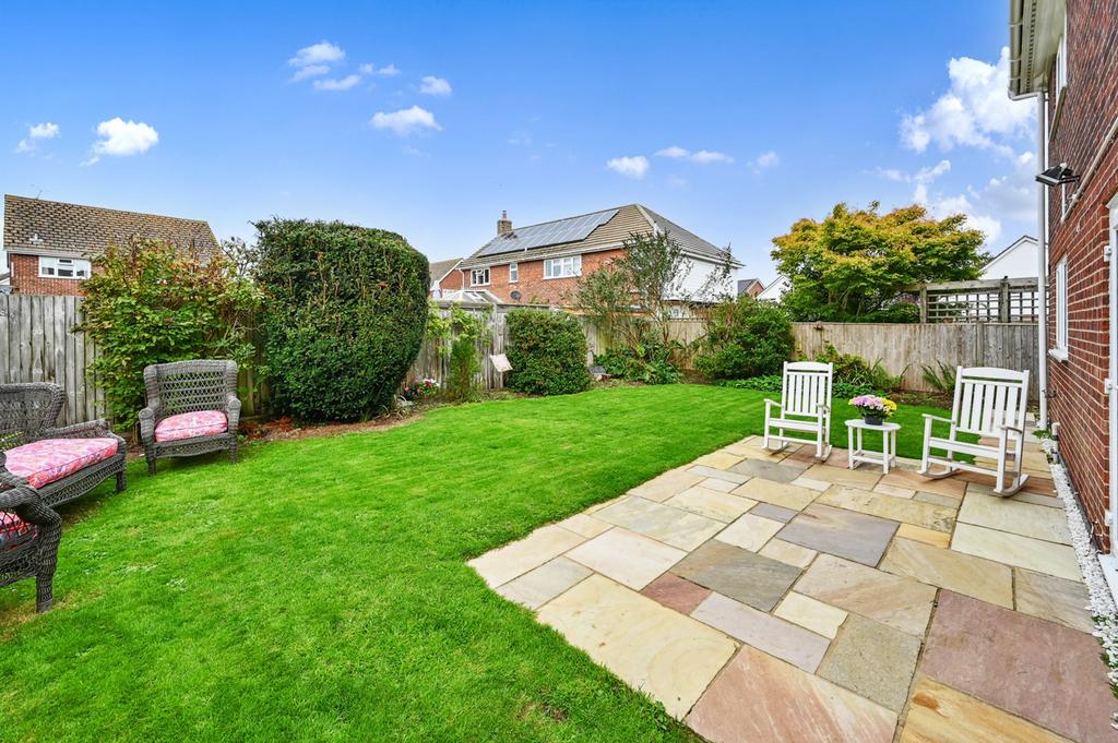 The rear garden is a generous and well-maintained outdoor space, laid mainly to lawn with established planting to the borders. A large paved patio provides the perfect area for outdoor seating and dining, with direct access from the house via French doors. Enclosed by fencing, the garden offers both privacy and security, making it an ideal setting for families, entertaining, or simply relaxing outdoors.