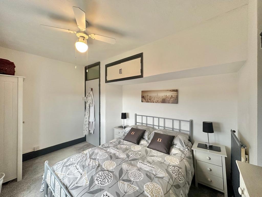 Bedroom two comprises of: a ceiling light point; a ceiling fan point; carpet flooring; a double glazed window to the front elevation; power points; a central heating radiator, and overhead storage.