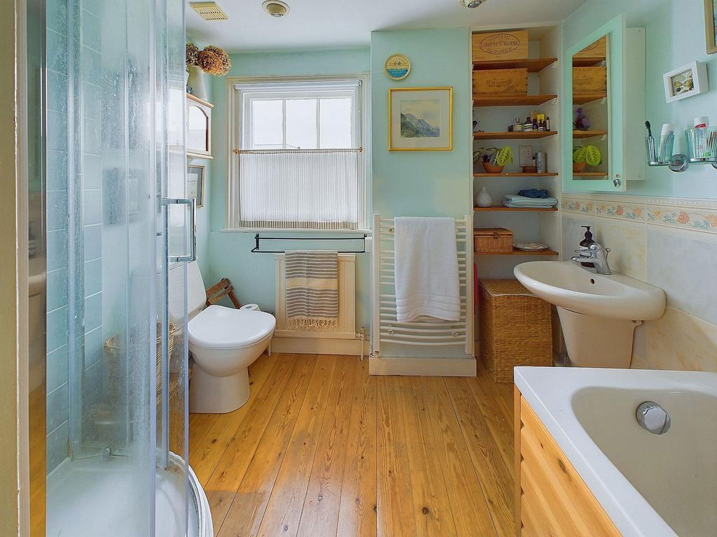 FAMILY BATHROOM West aspect. Comprising single glazed wooden framed window with secondary glazing, panel enclosed bath with shower attachment over, part tiled walls, hand wash basin, heated towel rail, radiator, low flush wc, step in shower cubicle with fully tiled walls and integrated shower attachment, recessed directable spotlights, single light fitting, extractor fan, wooden flooring.
