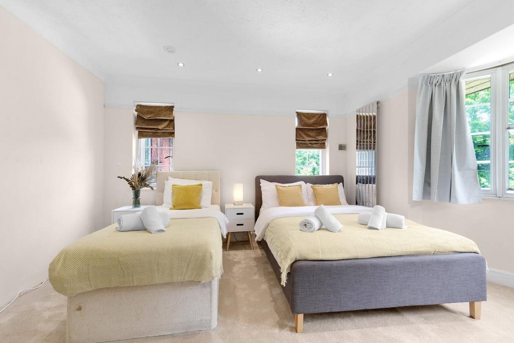 Each of the five bedrooms is thoughtfully designed, offering a peaceful retreat with quality furnishings and soothing décor. The master suite provides a luxurious sanctuary, complete with a king-sized bed, soft linens, and its own private en suite bathroom featuring sleek finishes and a walk-in shower. The remaining bedrooms are equally inviting, making this home ideal for families, business travellers, or group stays.