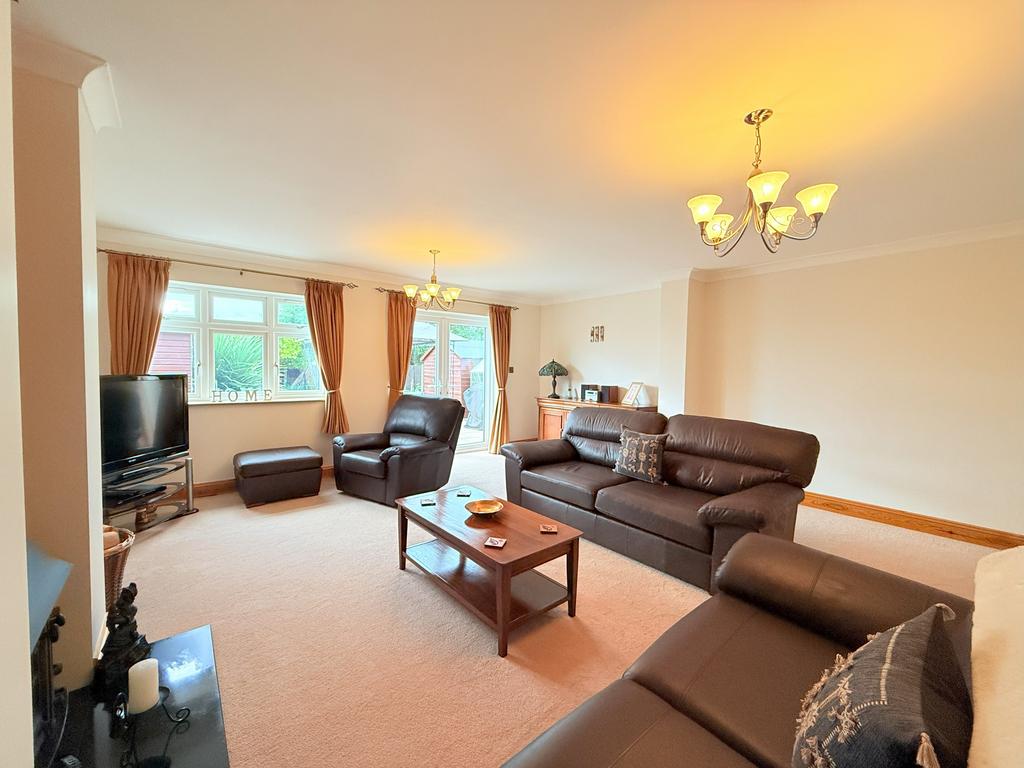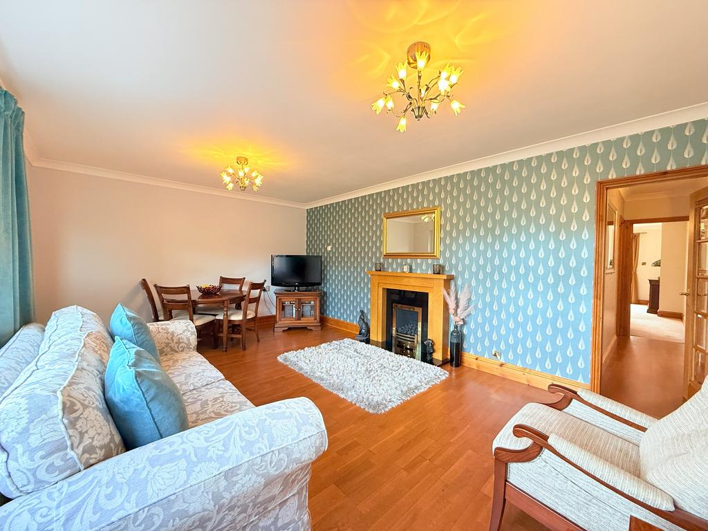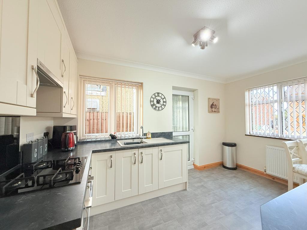 On entry, you are welcomed via an entrance porch that opens into the front living room a bright and spacious reception area that sets the tone for the home. This flows seamlessly into the fitted kitchen, complete with matching base and wall units, integrated oven, gas hobs, and a side door providing access to both the front and rear gardens.