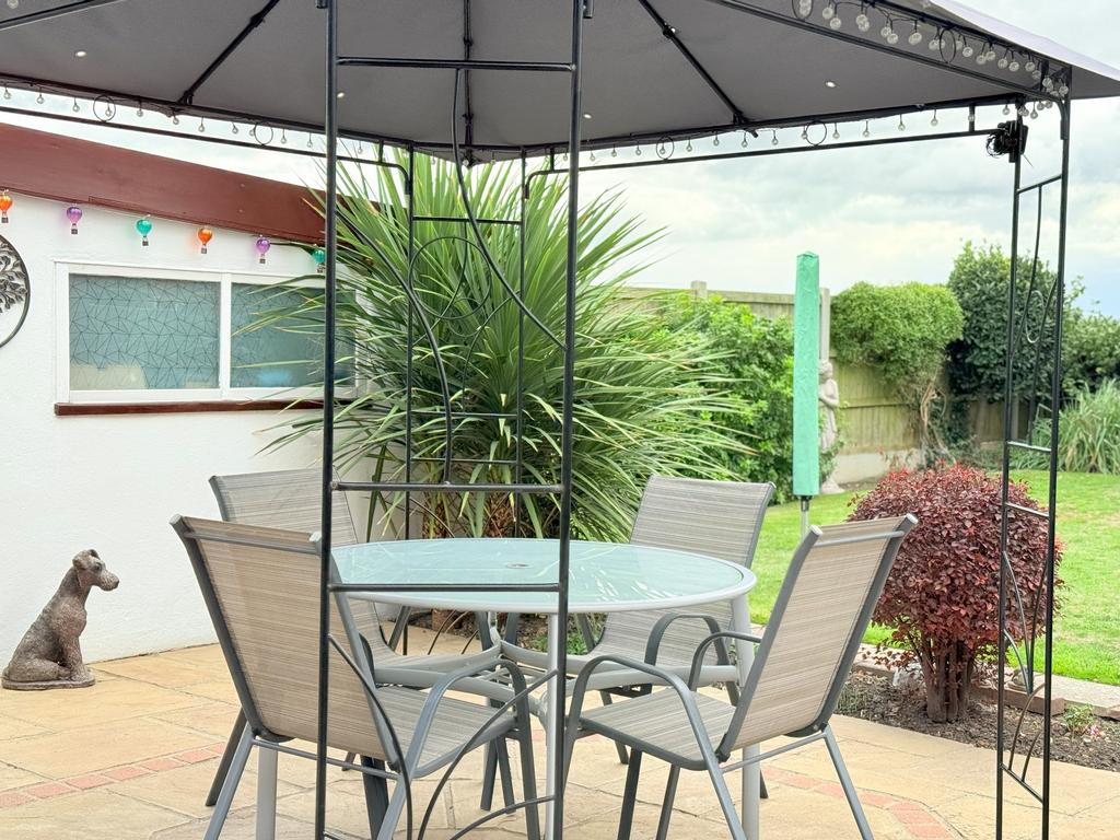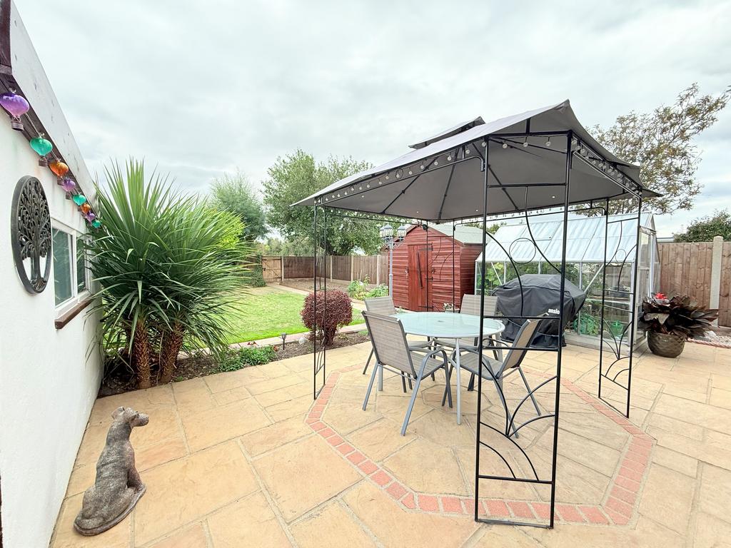 - Generous rear garden with patio, lawn, sheds, garden greenhouse, and open field views