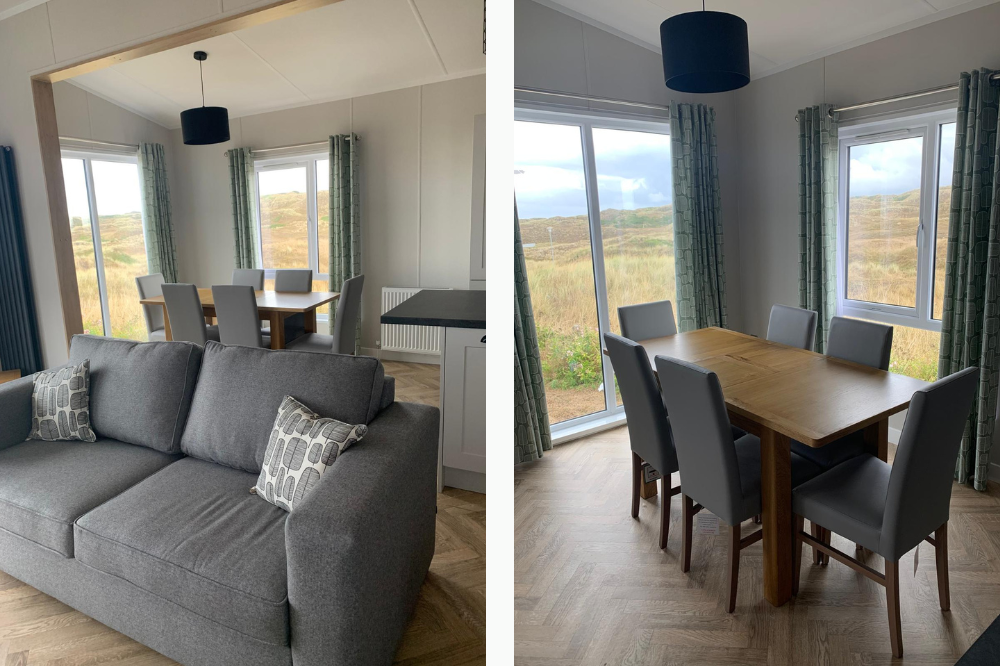 A modern and spacious three-bedroom holiday lodge (40 x 20 ft, sleeps up to 8) located at 56 Porth Point in the private owners’ area, with sea views to the front and uninterrupted dune views to the side. The home comes with a warranty until September 2026.
