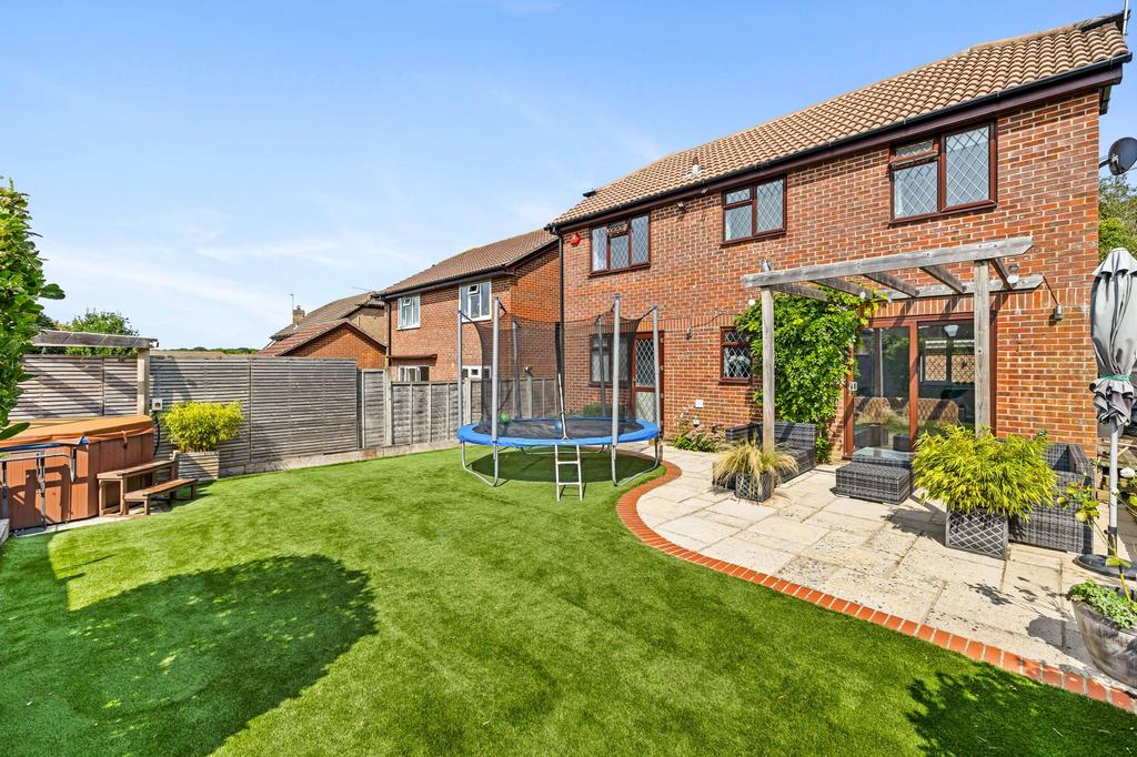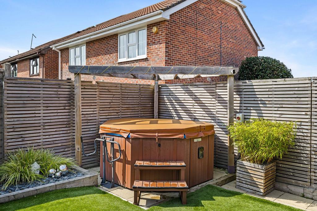 Outside there is a private block paved driveway with parking for 3 cars and an electric charger point. There is also a sheltered patio. The detached double garage benefits from 2 electric doors. Side access either side of the house leads to the south west facing landscaped 37’ x 34’ rear garden. A full width patio with eating/seating area is partially covered by a pergola. The remainder is laid to artificial lawn flanked by colourful borders. Hot tub, power, tap and lights.