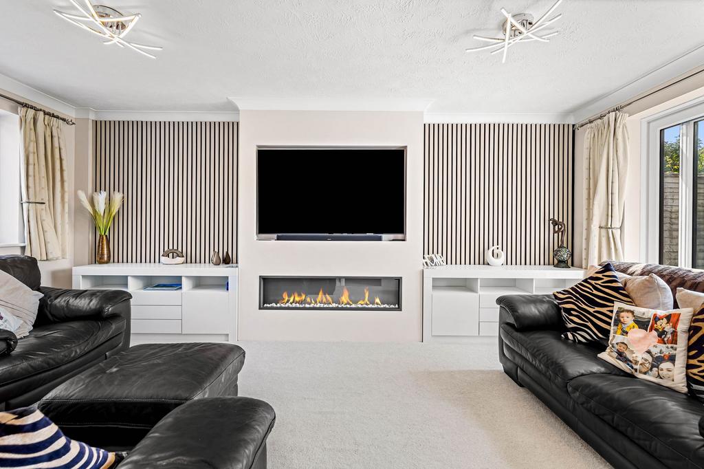 The dual aspect living room spans the length of the house with sliding patio doors to the garden and a contemporary real flame fireplace.