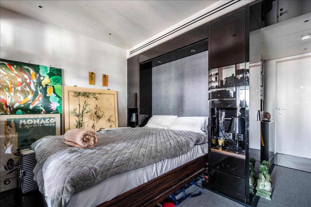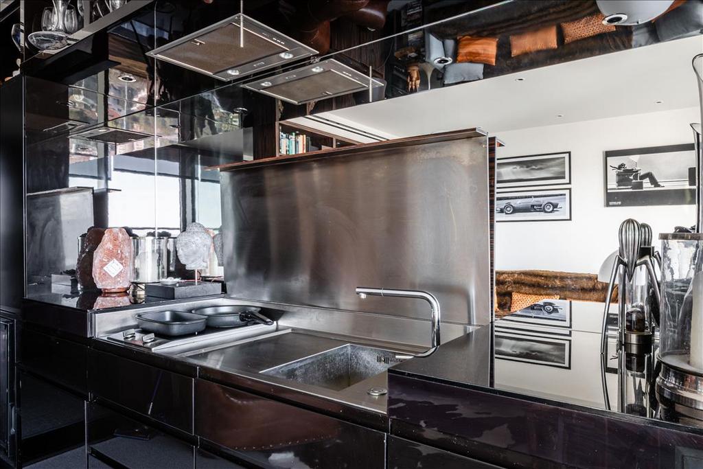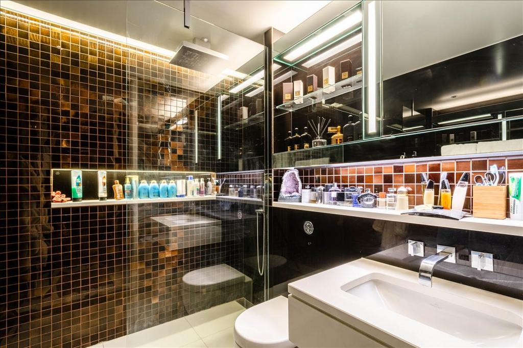 The open-plan kitchen contains high specification integrated Miele appliances and a surprising amount of cabinetry storage. The shower room adds a touch of refinement, while climate control and integrated smart home technology, including ceiling speakers and a central control panel, ensure a sophisticated and efficient setting. Every detail has been arranged to maximise available space and storage, ensuring that the apartment remains both elegant and practical.