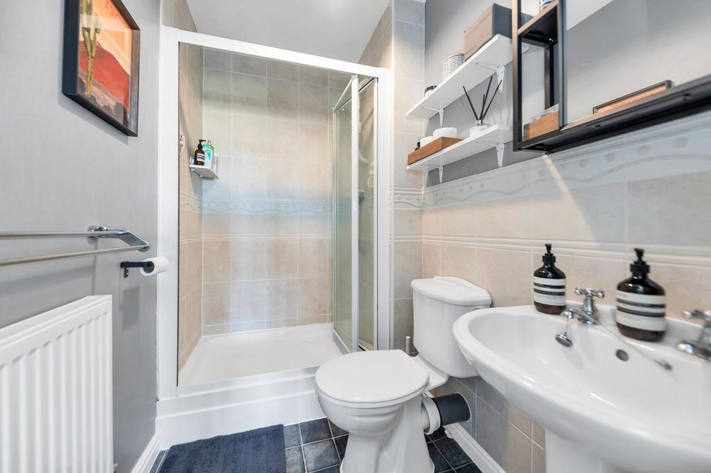 Through to the sleeping quarters, this lovely apartment offers further superbly presented accommodation with 2 double bedrooms, each with pendant lighting, carpets and a large window, and a bathroom comprising a bath with shower attachment, a WC and sink. The primary bedroom is particularly generous, benefiting from its own ensuite with a double shower, WC and sink.