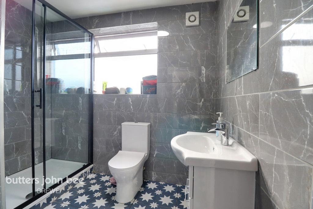 The ground floor presents versatile living, currently featuring two reception areas, one of which is currently being used as a comfortable ground-floor bedroom. The heart of the home is the modern, sleek kitchen, boasting contemporary grey cabinetry and integrated appliances. A downstairs bathroom completes this level, featuring a walk-in shower, a basin, and a WC, finished with elegant grey marble-effect tiling.
