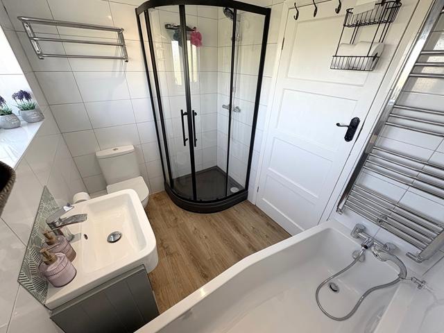 Upstairs, there are three bedrooms, with the main bedroom enjoying countryside views. The family bathroom includes a four-piece suite with a separate shower enclosure.