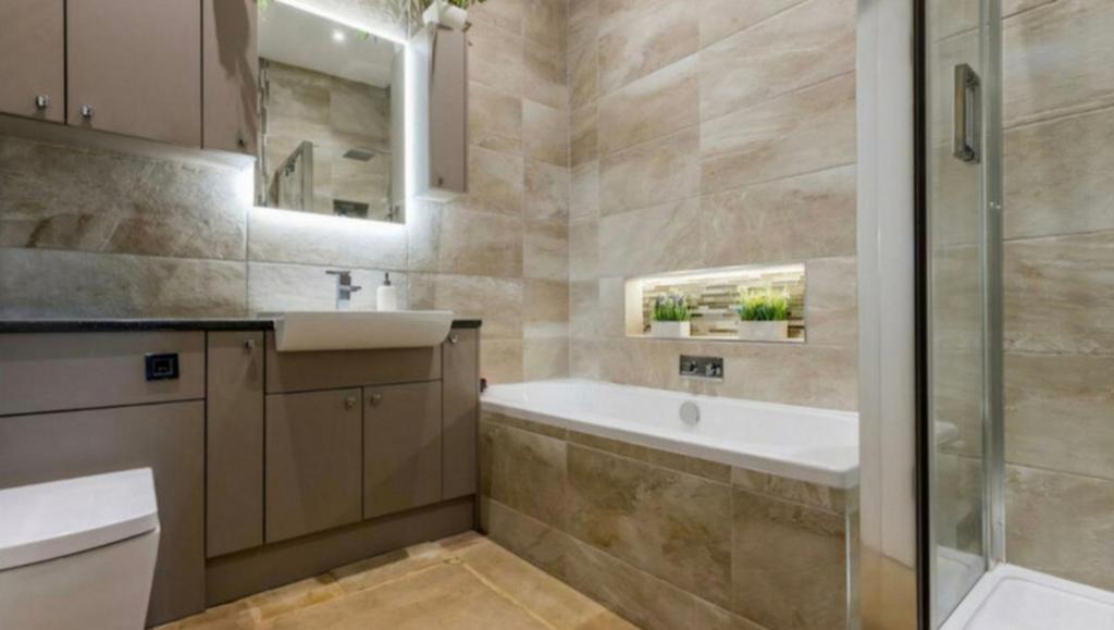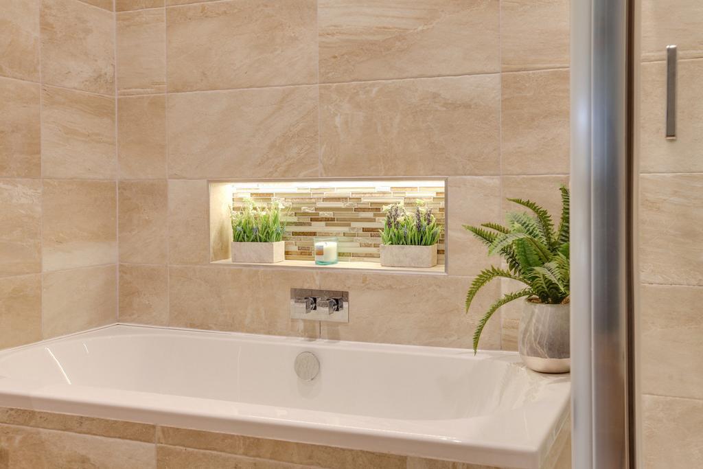 A true sanctuary on the ground floor, the bathroom combines contemporary elegance with spa like indulgence. A rainfall shower, deep tiled bath and sleek vanity with storage make this a room designed for relaxation. Textured tiling, feature shelving and soft lighting give a boutique hotel finish.