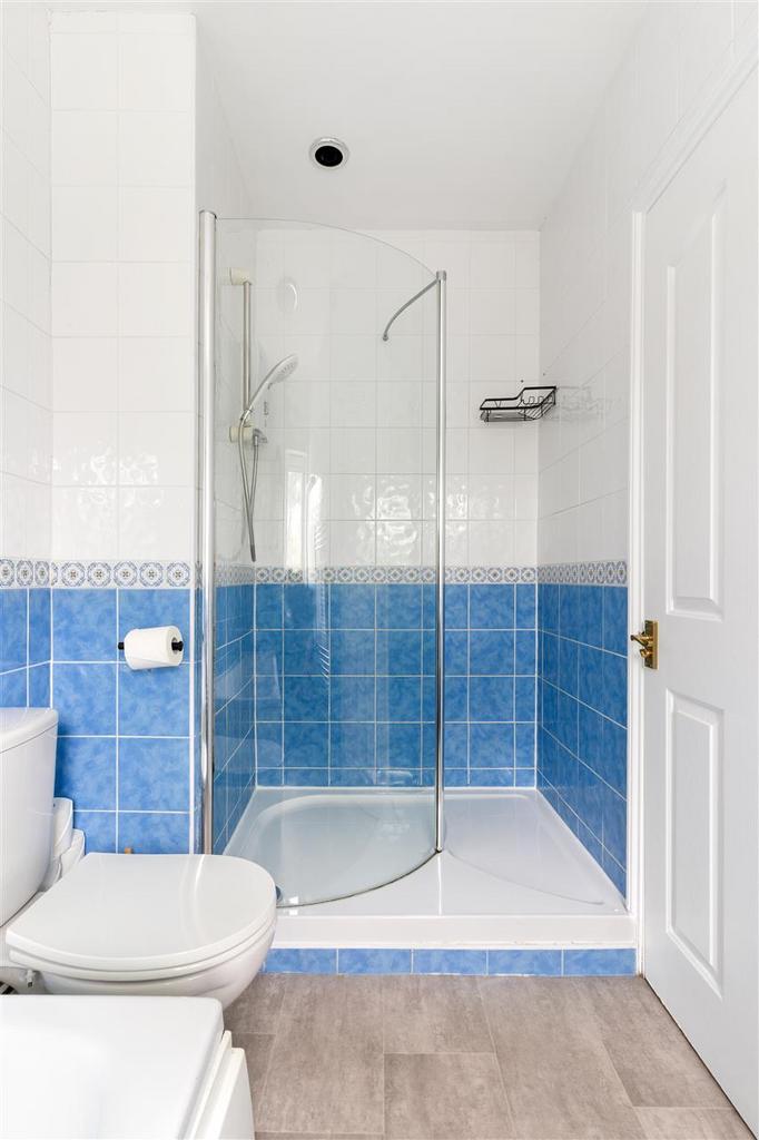Frosted UPVC double glazed window. Fitted with a white suite comprising; walk-in shower cubicle with chrome mixer tap and conventional shower head and glass screening, low-level flush wc, pedestal wash hand basin with chrome hot and cold taps, fully tiled walls, heated towel rail, wall light, laminate flooring.