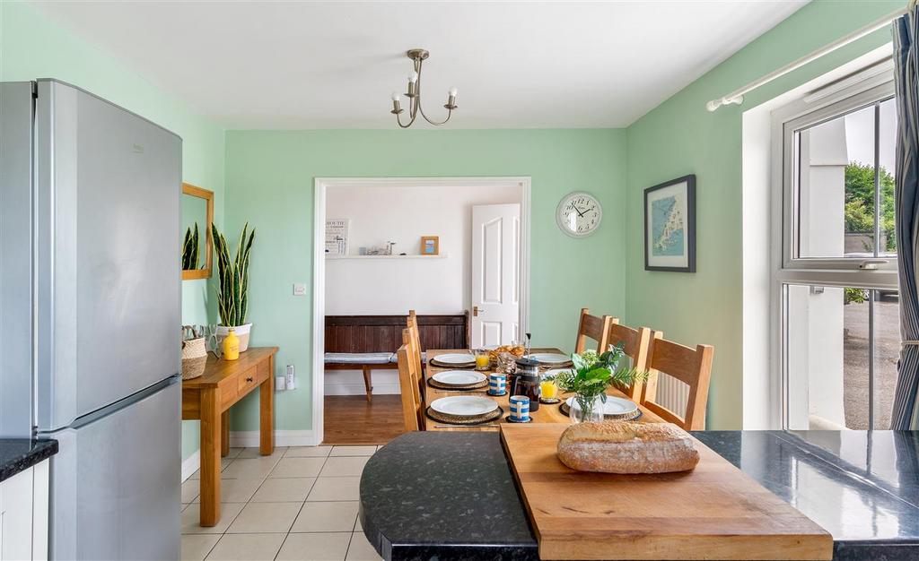 UPVC double glazed windows overlooking the front and side aspects. Fitted with a range of white contemporary wall and base units with black granite effect roll top work surfaces over and white tiled splashbacks, inset white ceramic 1 1/2 bowl single drainer sink unit with chrome mixer tap, space for washing machine and refrigerator/freezer, built-in electric oven and hob with stainless steel backplate and stainless steel extractor fan over, vinyl flooring, extractor fan, central strip light and central light fitting to the dining area.