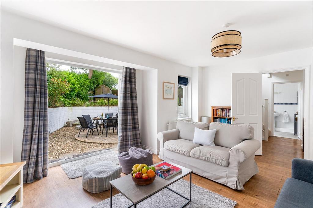 UPVC double glazed French doors set into recess that opens onto the enclosed rear garden, two small UPVC double glazed windows to the side and rear with roller blinds, feature fireplace with living flame fire set on a black hearth with black backplate, white painted surround and mantle, polished wood floors, central ceiling pendant light, radiator.