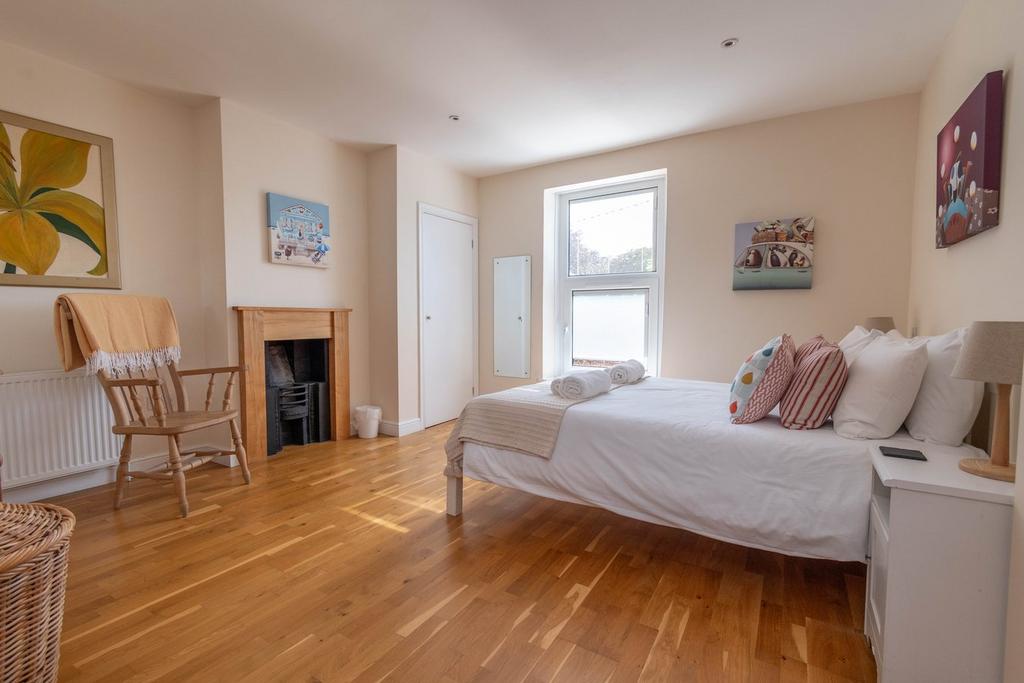 Double glazed window to side, feature cast iron fireplace with wooden surround, natural wood strip flooring, radiator, large wardrobe cupboard, ceiling recessed downlighters, door to;