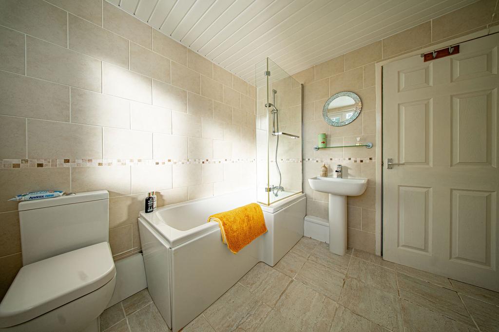 Upstairs, the first floor hosts two bedrooms and a house bathroom. The master bedroom is an excellent size and comes complete with fitted wardrobes, providing ample storage while maintaining a sleek finish. The second bedroomis also generously proportioned, making it ideal as a child’s bedroom, guest room, or even a home office for those working remotely. The bathroom is modern and fully tiled, fitted with a three-piece suite including bath with overhead shower, WC, and wash basin – combining style and functionality in equal measure.