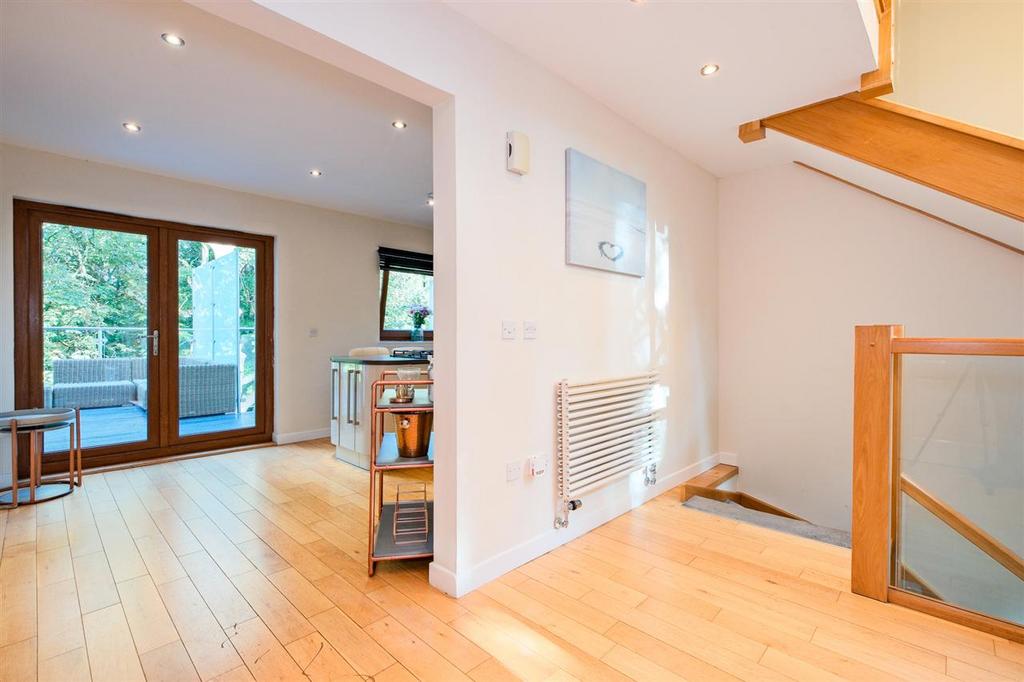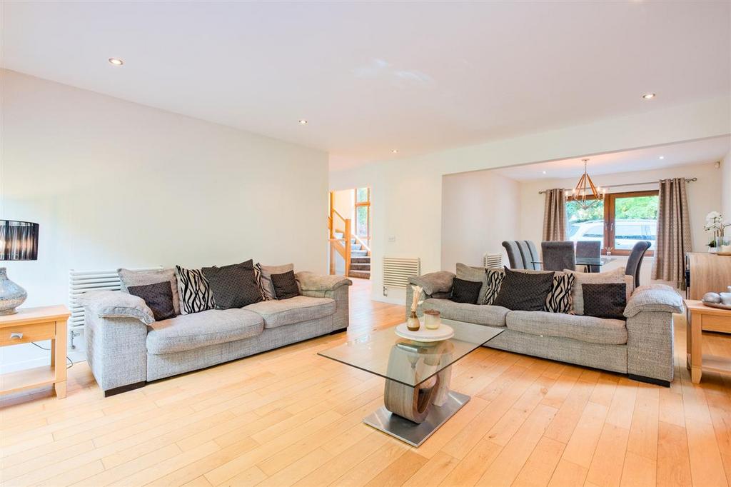 What about a tastefully decorated, spacious lounge open plan with the dining room, with double aspect windows to the front and side, wall to wall glazed panels with double doors to the rear, all allowing for an abundance of natural light to filter through, an inset fireplace giving a natural focal point in the room, fresh neutral décor and real wood flooring throughout?