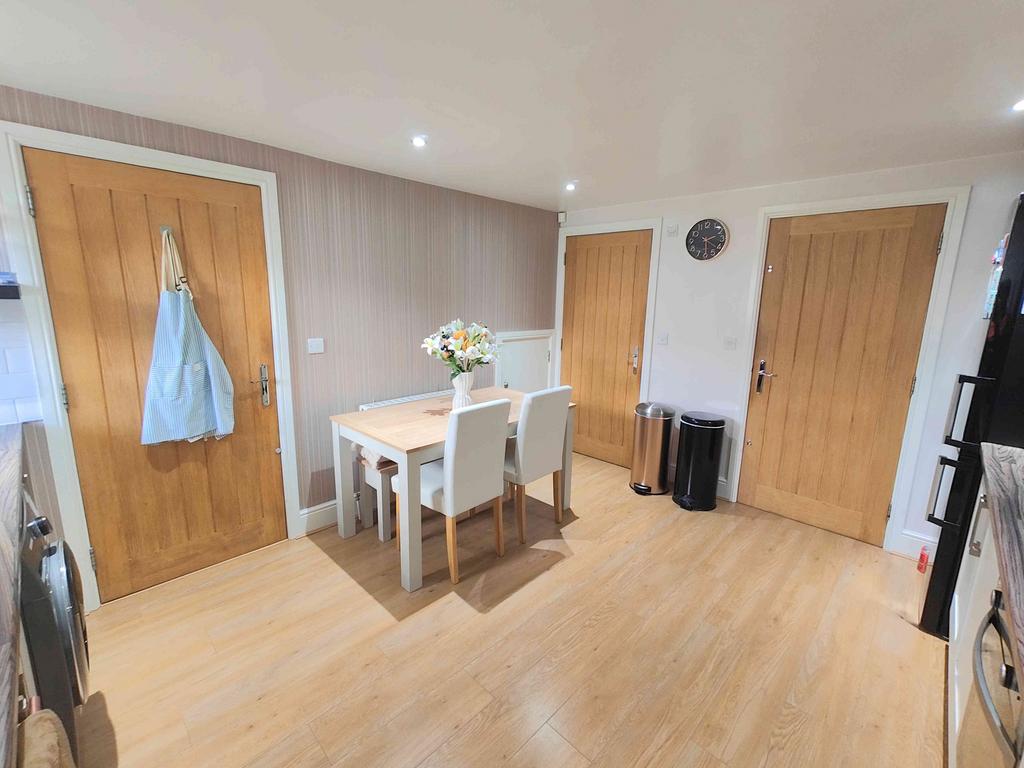 A beautifully presented and highly functional dining kitchen that features laminated work surfaces in an “L” shape to two sides of the room, all with over and under counter cupboards and drawers. An under stairs cupboard offers additional storage space. To one corner of the room there is ample space for a family dining table. With an integrated hob, integrated oven, stainless steel extractor hood, double radiator, plumbing for a washing machine, splashback tiling, wood laminate flooring, uPVC double glazed window to the rear elevation, ceiling inset spotlights, space for a fridge/freezer and a stainless steel sink with stainless steel mixer tap.