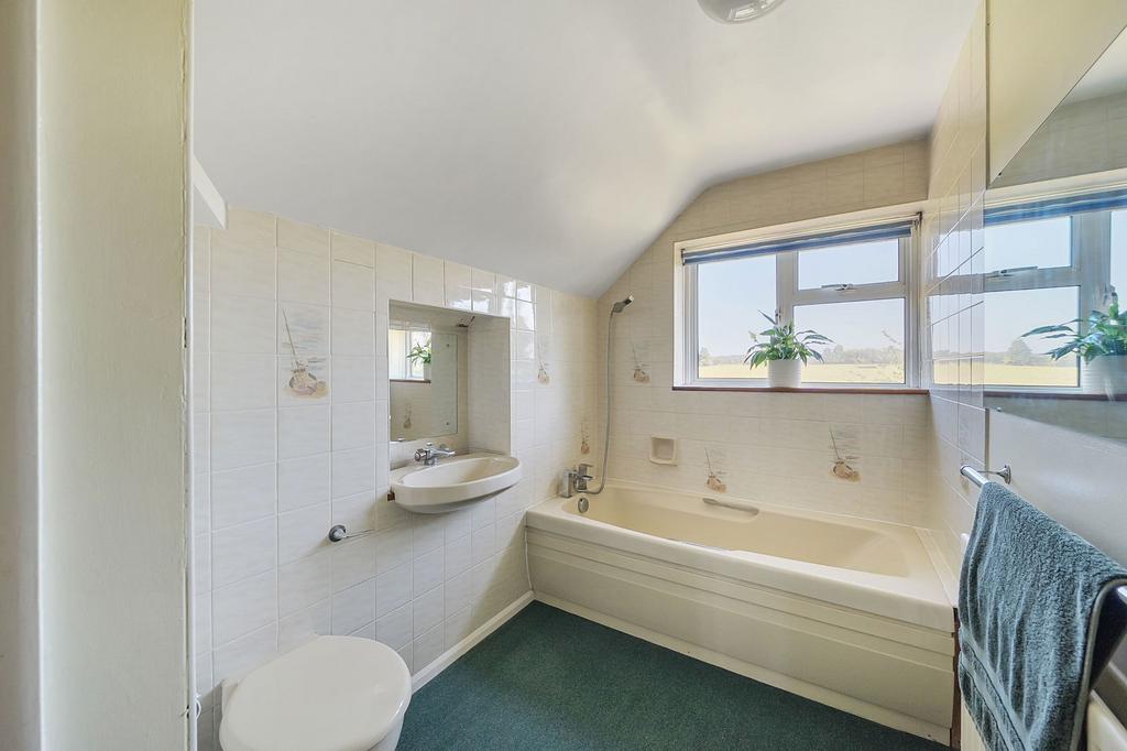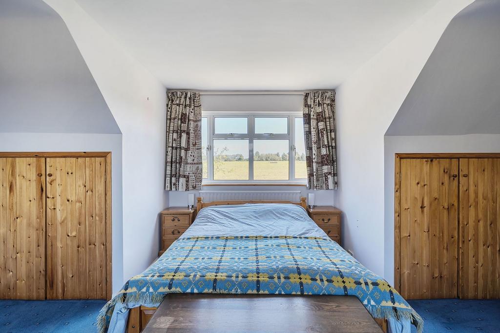 Upstairs, four bedrooms are arranged off the landing. The principal, dual-aspect bedroom enjoys far-reaching views across the fields and includes an en-suite shower room and useful built-in/eaves storage. Three further bedrooms are served by a modern family bathroom, while additional eaves cupboards and fitted units provide excellent storage on this level.