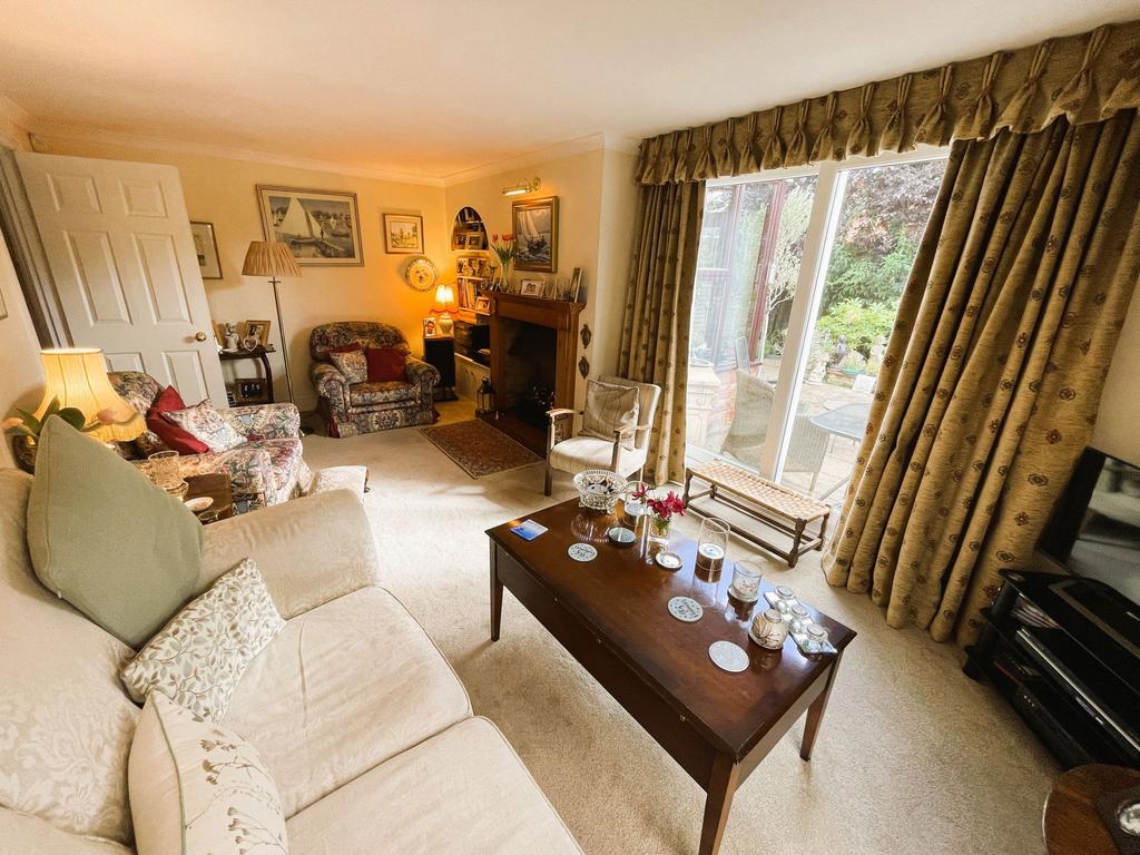 Double glazed sliding patio doors to rear wooden and glazed panelled French doors out to the Sun Lounge. Feature fireplace housing living flame gas fire set on a tiled hearth with a wooden surround and mantle. Shelved display niche to the side. Radiator. Two wall light points.