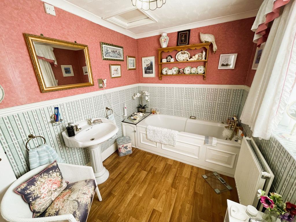 Three-piece bathroom suite comprising a panel bath with a mixer tap and shower head over, pedestal wash hand basin and WC. Double glazed window to side. Ceramic tiled splashback to half height. Radiator. Vinyl flooring. Loft access.