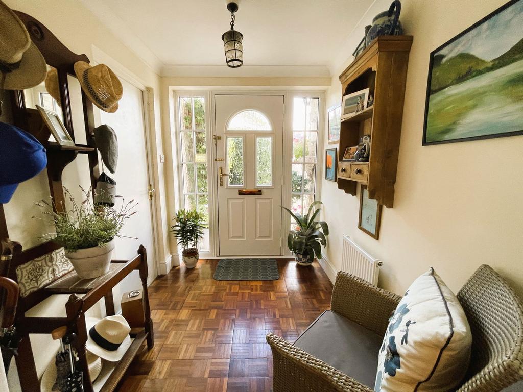 Double glazed panelled door with side glazed panels leads into the Entrance Porch. Door to Garage. Radiator. Parquet style flooring. Wooden and glazed panel door with side glazed panel leading into the Entrance Hallway.