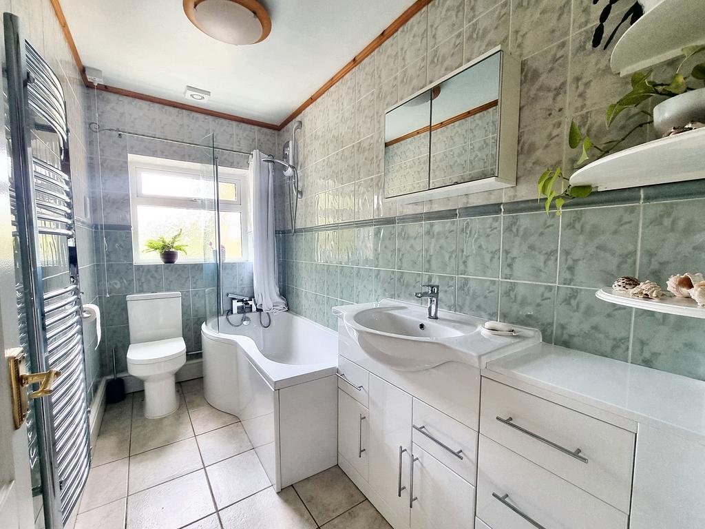 BATHROOM with tiled floor, fully tiled walls, window, heated towel rail, white suite with d-shaped panelled bath screen and shower over, WC and washbasin with vanity cupboards, shelf and wall mirror over with extractor fan.