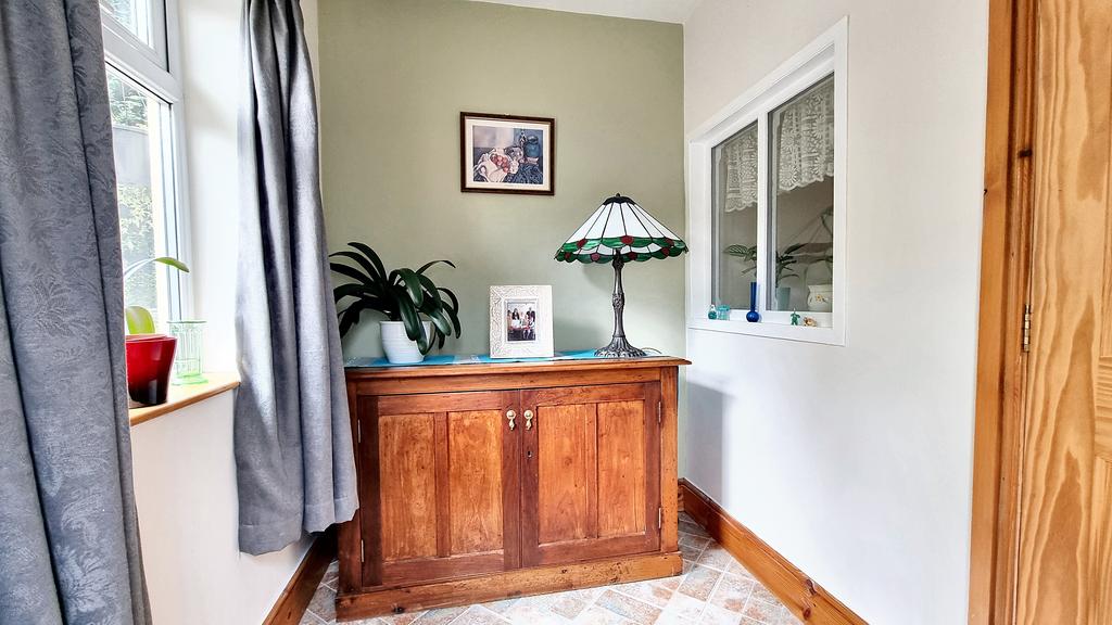 Leading off the Inner Hallway there is an enclosed second hall with deep storage cupboard and, a window with shelving.
