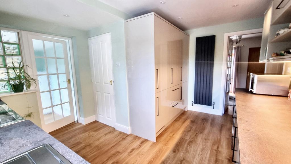 L-Shaped KITCHEN (4.00m x 3.70m approx)(13'1" x 12'13" approx) with wood laminate floor, extensive range of built-in units including floor and wall cupboards incorporating deep drawers, shelving, laminate worktops, and stainless steel double bowl sink unit. Integrated dishwasher, floor to ceiling storage cupboards, integrated fridge/freezer, 'Belling' electric range with cooker hood over, rear window with superb views, ceiling spotlights, radiator, internal window, and glazed panelled door to utility.