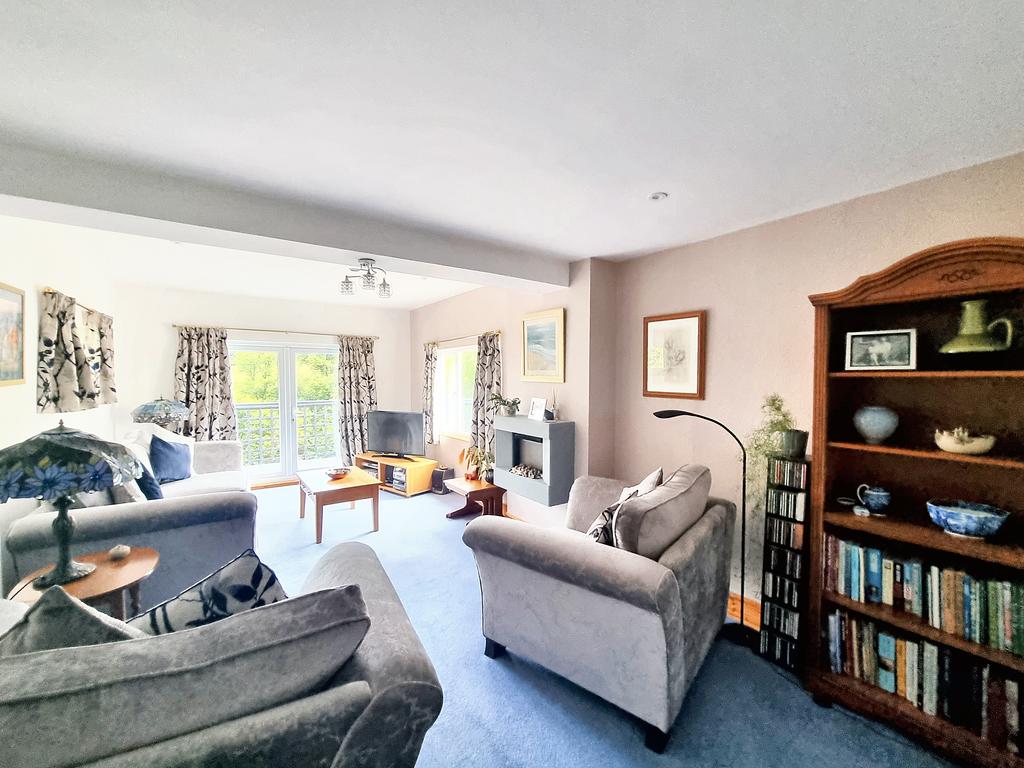 SITTING ROOM (7.00m x 3.60m approx)(22'9" x 11'08" approx) with fitted carpet, wall mounted electric fire, two side windows, TV point, telephone point, two radiators, ceiling spotlights, and glazed double doors to the balcony and gardens.