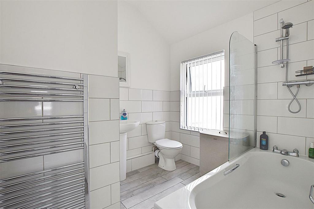 Bathroom - A modern suite comprising low level wc, pedestal wash hand basin with mixer tap, panel enclosed bath with chrome mixer tap with additional shower over bath with chrome controls, chrome hand shower attachment and shower head, chrome heated towel rail, part tiled walls, obscure double glazed window to the side elevation.
