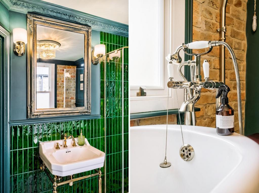Beneath the main floor, a refurbished cellar adds valuable, versatile space to the home, lending itself perfectly as a home office or gym. Nearby, a charming ground-floor W/C showcases a piece of the home's history as the original Victorian tiles discovered in the cellar have been thoughtfully repurposed as a splashback around the washbasin, and set within a colour scheme that honours their legacy. At the heart of the home lies a truly stunning kitchen/diner. Rich navy cabinetry sits beneath a mix of crisp white quartz and warm oak worktops, framing a traditional butler sink, accompanied by stunning brushed gold fittings. A central island offers additional preparation space and informal dining, while double-glazed sash windows and French doors, all south-facing, flood the space with natural light. Exposed brickwork, original flooring, and high-end integrated appliances complete this show-stopping room, which opens directly onto the landscaped rear garden.