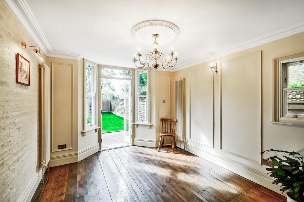 The striking exterior immediately captures the eye, with beautifully cleaned London brickwork and original Victorian mosaic path tiles leading to the front door. Elegant wrought iron fencing completes the picture, setting the tone for what lies within. Upon entering, the wide and welcoming hallway retains all the charm of its era with its original cornicing and polished flooring. The grandeur continues through to a beautifully proportioned double reception room, where the original floorboards, intricate cornicing, and restored Victorian fireplaces are complemented by newly installed double-glazed sash windows. French doors open from the rear of this space onto the garden, allowing natural light to pour in and offering seamless access to outdoor living.