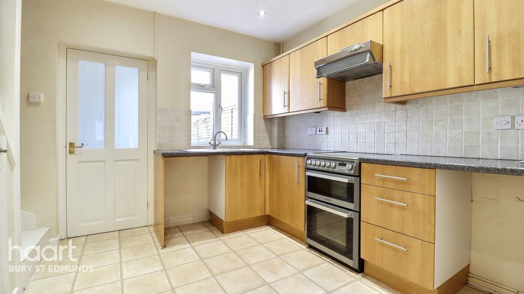 Wall mounted units and work surfaces with units under. Tiled splash backs. Tiled floor. Radiator. Under stairs storage cupboard. Stairs to first floor. UPVC double glazed window to rear aspect. Space and plumbing for an automatic washing machine. Stainless steel sink unit and drainer. Electric cooker with hood over.