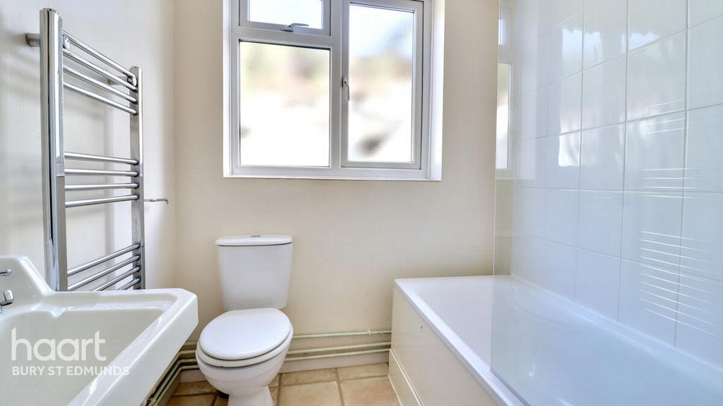 Suite comprising low level WC. Wash hand basin. Panelled bath with shower over and shower screen. Heated towel rail. UPVC double glazed window to rear aspect.
