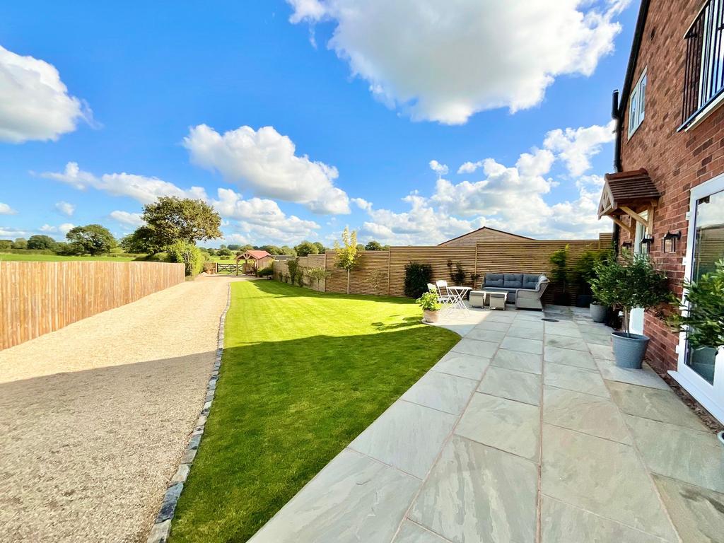 Outside, the gated entrance opens onto an immaculate front lawn and an expansive driveway with planning permission (application number 23/3000N) for a double garage that also includes a side store. The property benefits from external lighting, as well as security lighting powered by motion sensors. The rear garden is beautifully landscaped with a broad Indian stone patio, level lawn and contemporary fencing, creating the perfect setting for outdoor entertaining or quiet evenings watching the sunset.