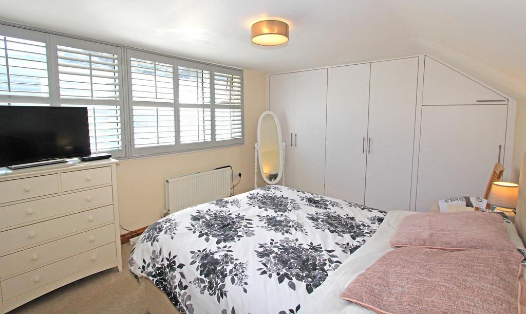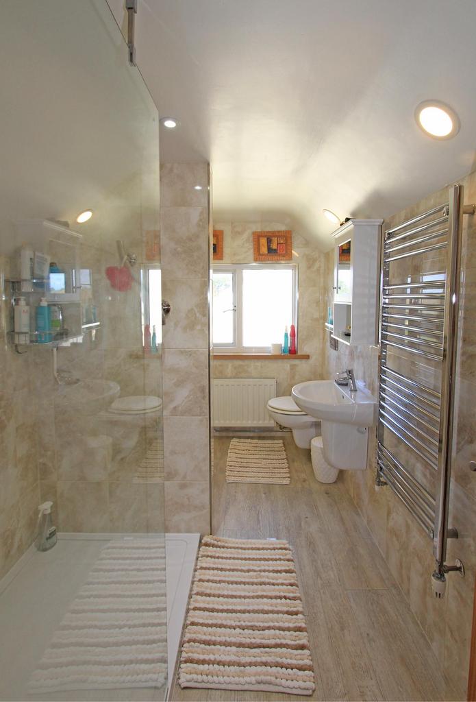 The ground floor features an entrance hall, an L-shaped living room with patio doors opening to the garden and a dining area and archway opens to the fitted kitchen with an adjoining utility room, a double bedroom and a bathroom. The lower level offers a further double bedroom with built-in wardrobes, while the first floor comprises the principal bedroom suite with bedroom and ensuite shower room.
