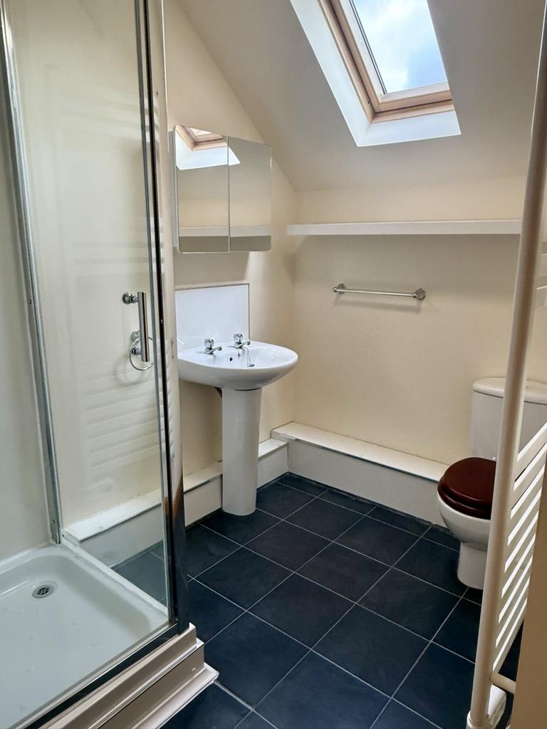 Corner shower cubicle. White WC and wash hand basin. Velux window. Vinyl floor tiles. Wet wall within the shower cubicle. Heated towel rail. Extractor fan.