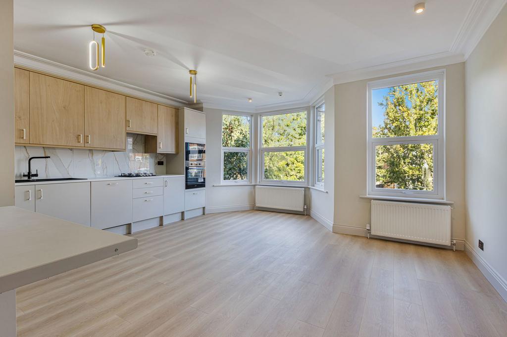 The home unfolds over the first and second floors, beginning with a bright and airy reception room that is flooded with natural light from a large bay window and features elegant wood flooring. This room flows effortlessly into the open-plan kitchen, which is fitted with brand-new, integrated appliances for a clean and sleek finish. The first floor also houses a double bedroom and a beautifully designed family bathroom with striking green tiles and gold fixtures. A further double bedroom on the half-landing has been cleverly designed to function as a self-contained studio, benefiting from its own meter and en-suite bathroom. The top floor is home to the main principal bedroom with a stunning en-suite shower room, as well as another double bedroom. The property also comes with a private section of the garden, accessible from the side of the house.