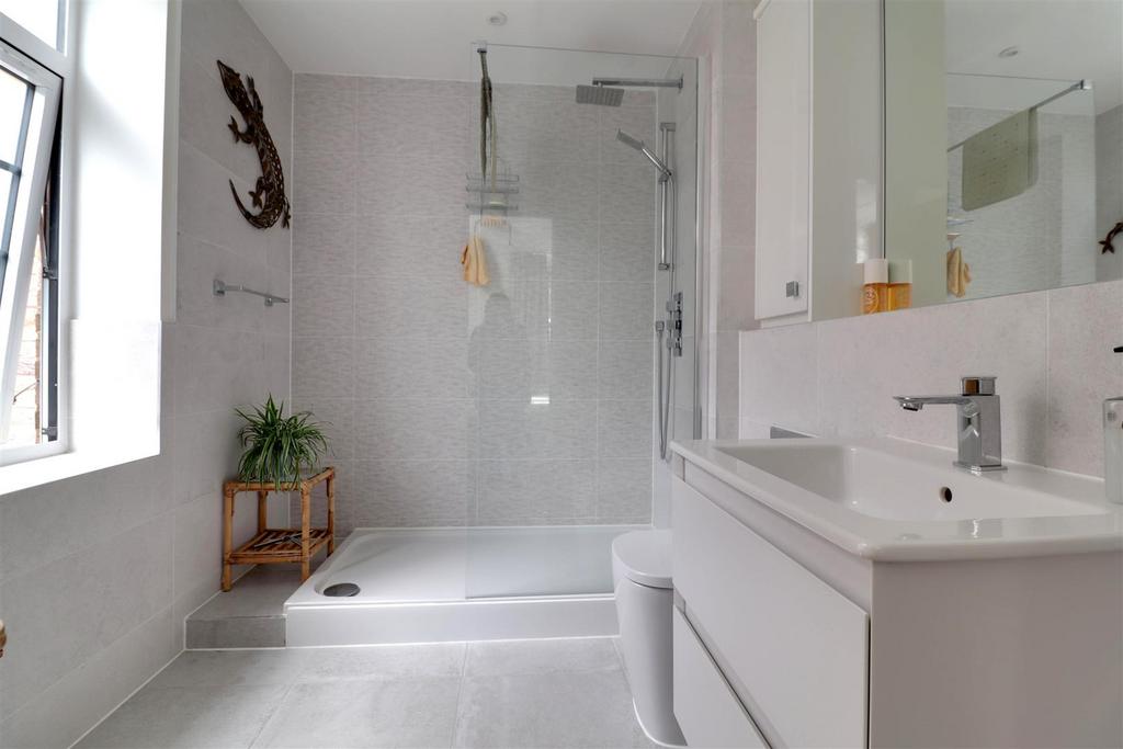En-Suite Shower Room - uPVC double-glazed window to rear elevation. Low-level WC, wash hand basin and walk in waterfall shower with two shower heads. Heated towel rail.