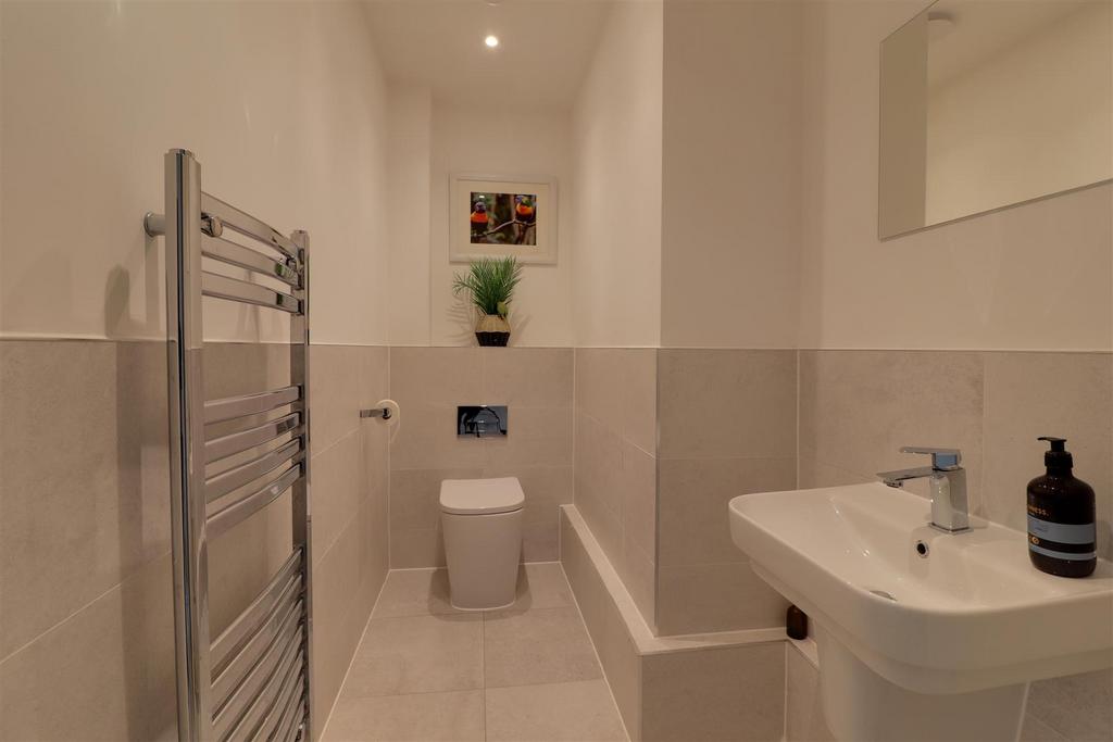 Cloakroom - Low-level WC and wash hand basin. Heated towel rail.