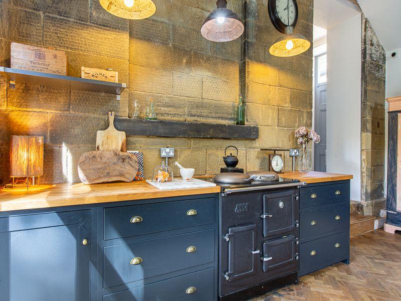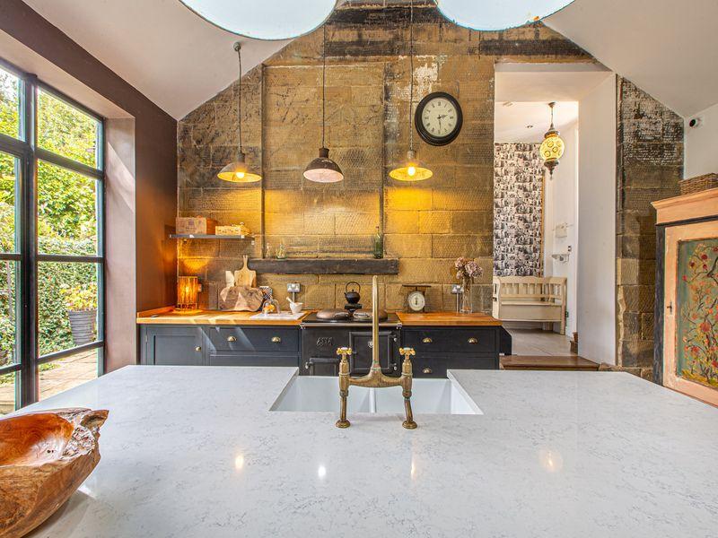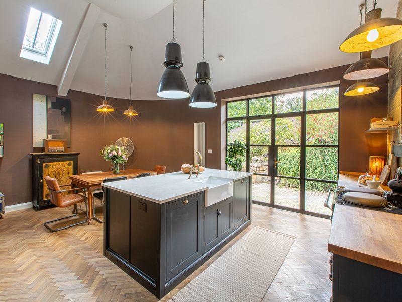 The deVOL kitchen is a true centrepiece, an extension of the original building and decorated in a bold yet refined palette of contrasting neutrals and luxurious deep brown tones. Industrial-style pendant lighting hangs above the quartz countertop featured on the island, adding drama and atmosphere, while wooden worktops along the perimeter balance warmth with practicality. Antique brass hardware, smoked, solid oak parquet flooring, and a high vaulted ceiling enhance the sense of timeless elegance and craftsmanship. This striking space has been designed for both function and style, with Crittall-style doors opening directly onto the south-west facing garden, ensuring the room is always filled with natural light and a seamless flow to the outdoors. A separate shaker-style utility room and W/C provide additional practicality while complementing the home's character.