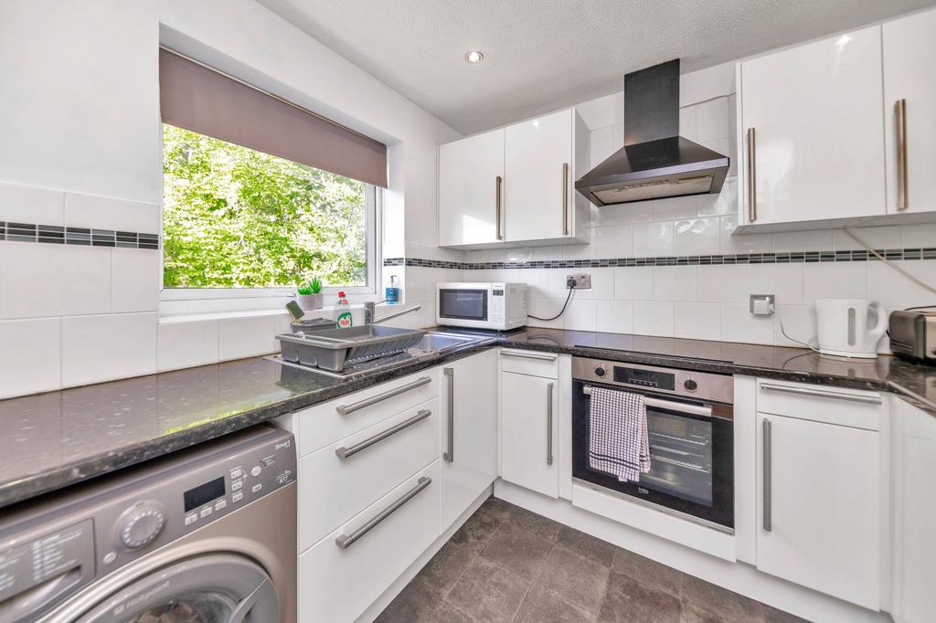The kitchen is a very good size, enjoying a large window, a range of base and wall units, laminate worktops, tiled flooring and splashbacks, inset lighting, integrated storage, an integrated oven, hob and extractor hood, and space for a fridge/freezer, washing machine and other small kitchen appliances.