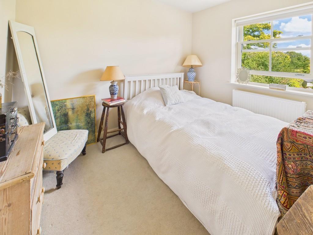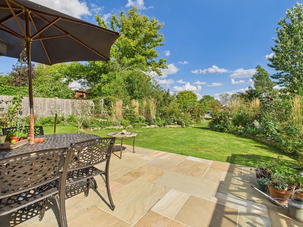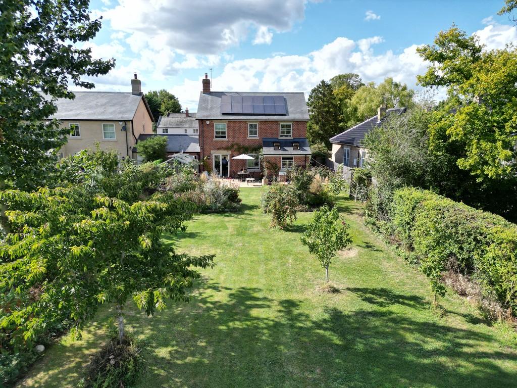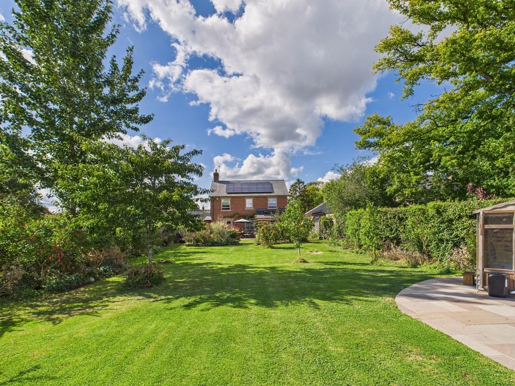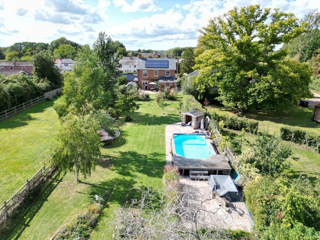 This red-brick property features charming period sash windows and is situated to the left of a shared shingle driveway. The property offers a lawn area at the front, parking space for up to three vehicles, and a spacious power-fed garage. A walkway along the left side of the property leads to a fitted air source heat pump, ensuring eco-efficient heat and underfloor heating throughout. One of the highlights is the large 0.25-acre (STS) south-facing garden with stunning rural views, ideal for entertaining and al fresco dining. This outdoor space includes an extensive patio area, accessible via French doors directly from the kitchen/dining area, a wonderful swimming pool with a decking area and a summer house. A private septic tank is conveniently located just beyond the patio, leading onto a lawn area.