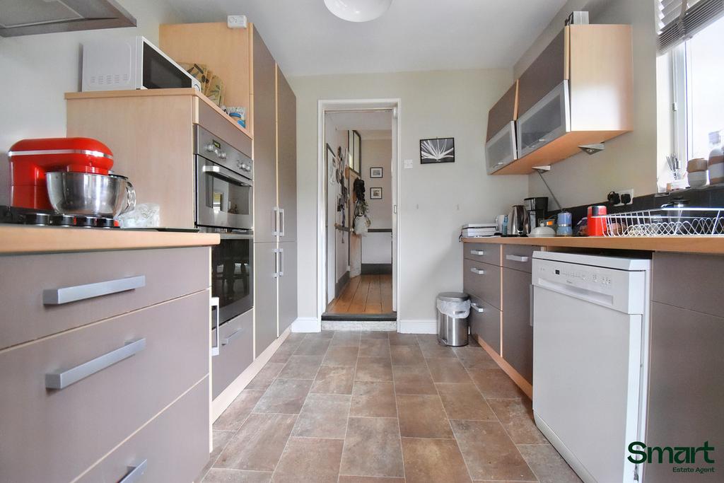 The kitchen offers excellent storage solutions, ample room for appliances, and access to two convenient storage areas as well as the rear garden, providing both practicality and potential for further enhancement.